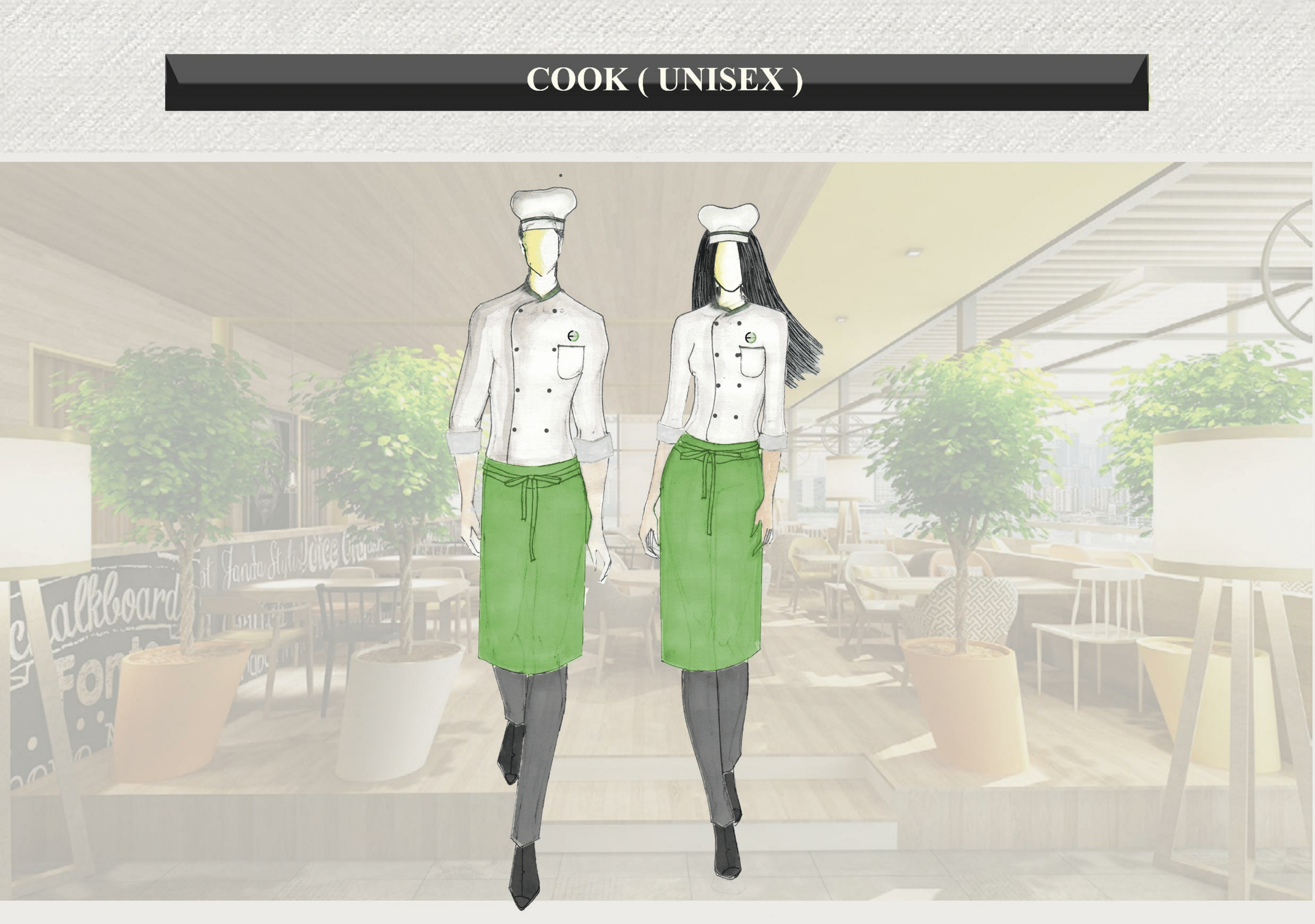 Kitchen uniforms make them always comfortable in the process of creating dishes. Uniform cook at Fusion’s restaurant with two colors : clean white and fresh green.