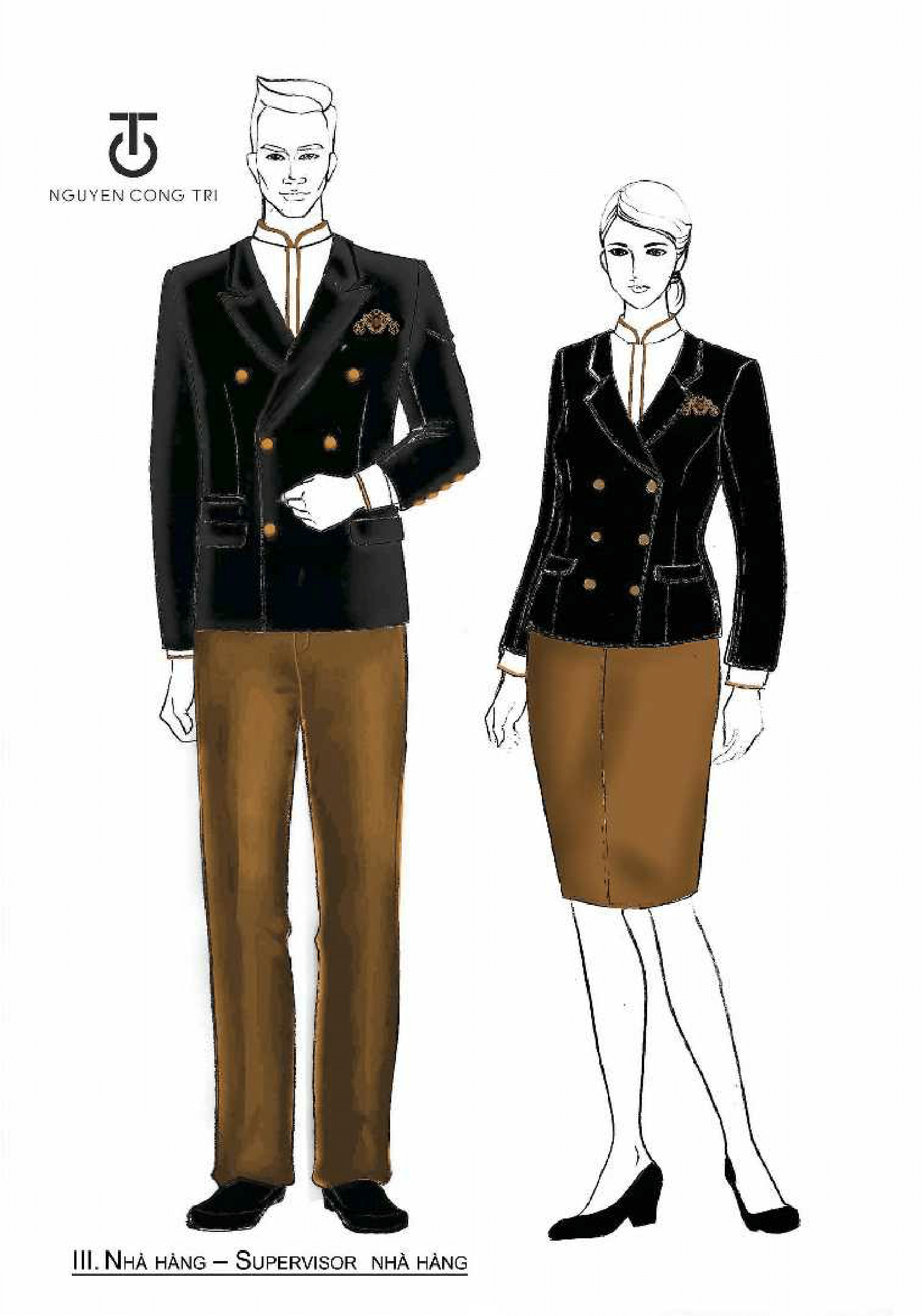 Therefore, the hotel uniform has two main colors: black and gold. Black comes with power, elegance and solemnity. Costumes with black will show the elegance and solemnity of the hotel. The yellow color will create a feeling of happiness. It is also the color of wisdom and power. Yellow gives a warm feeling, increases the interest and ability to mental function. The light yellow color also carries considerable attraction. Copper gold also shows power, but using too much yellow will be counterproductive so the costumes must incorporate copper gold in a very delicate way.